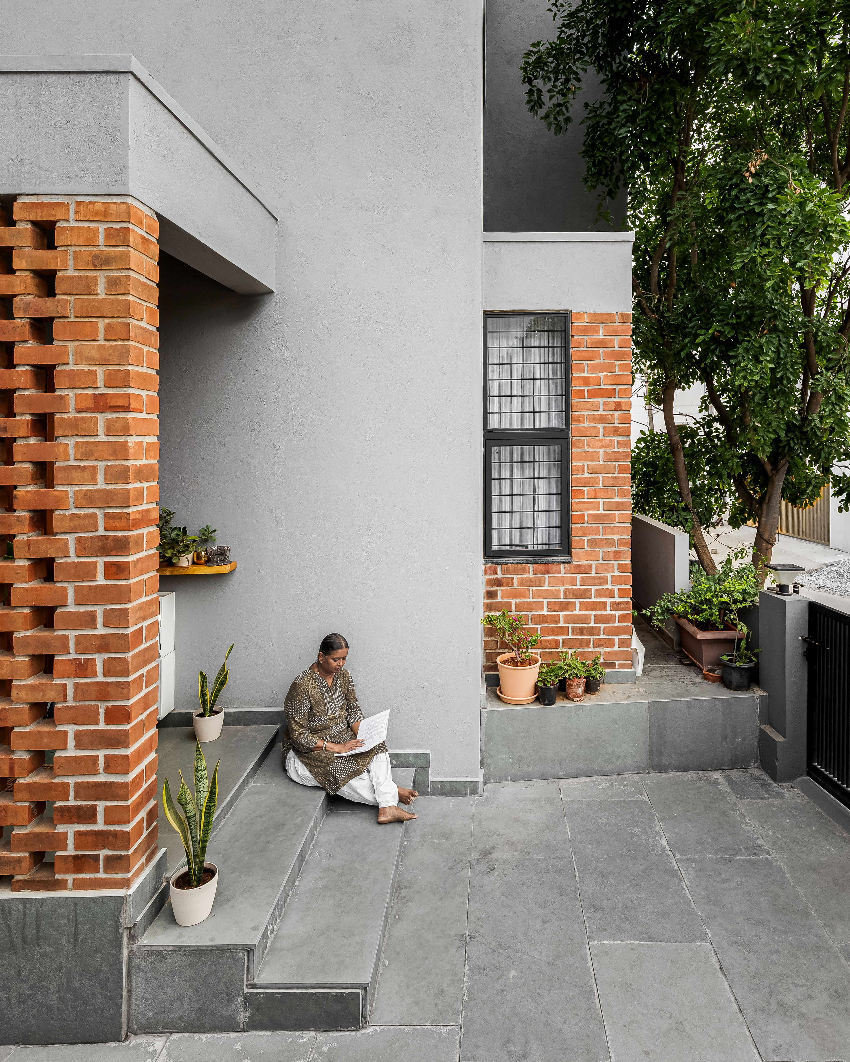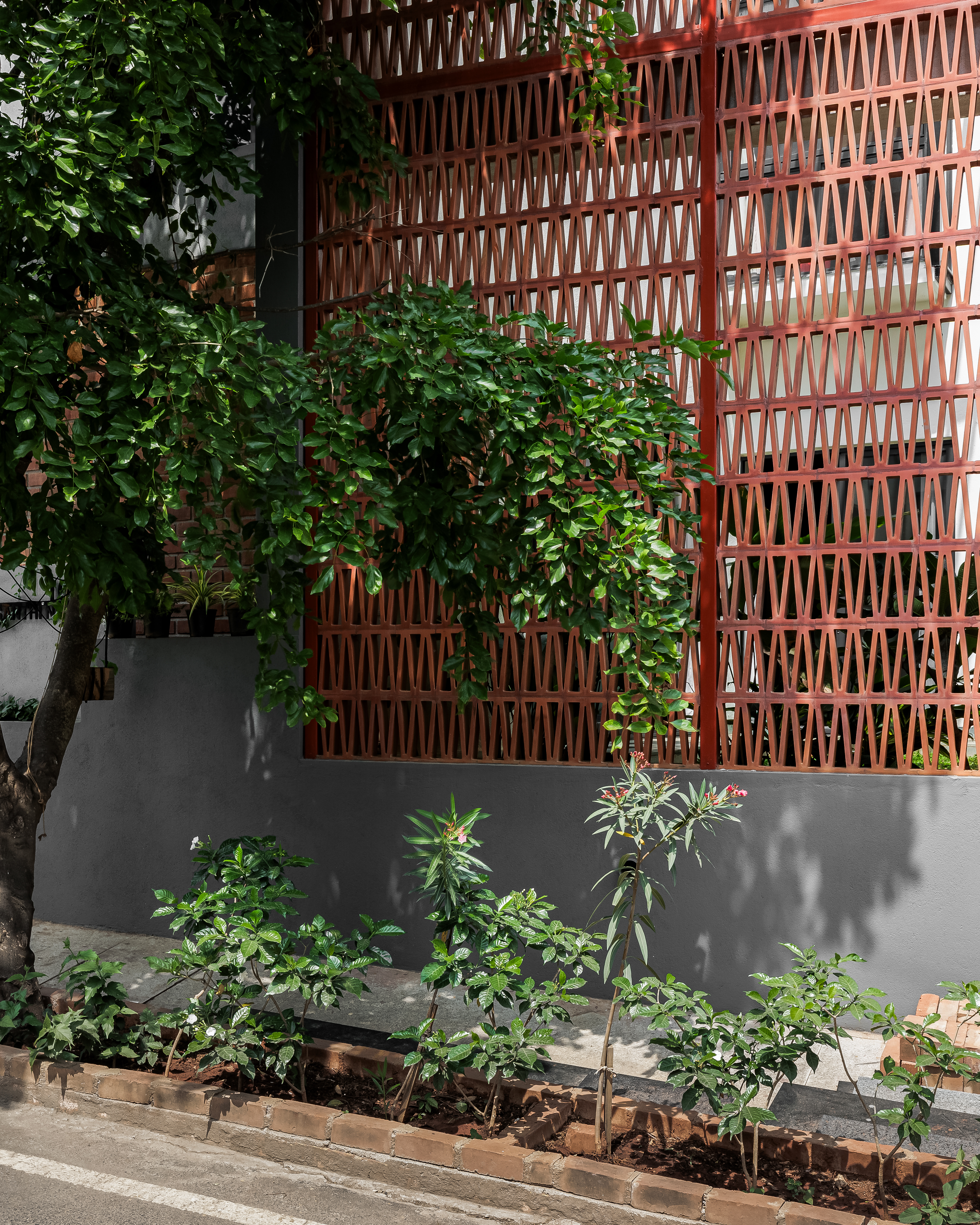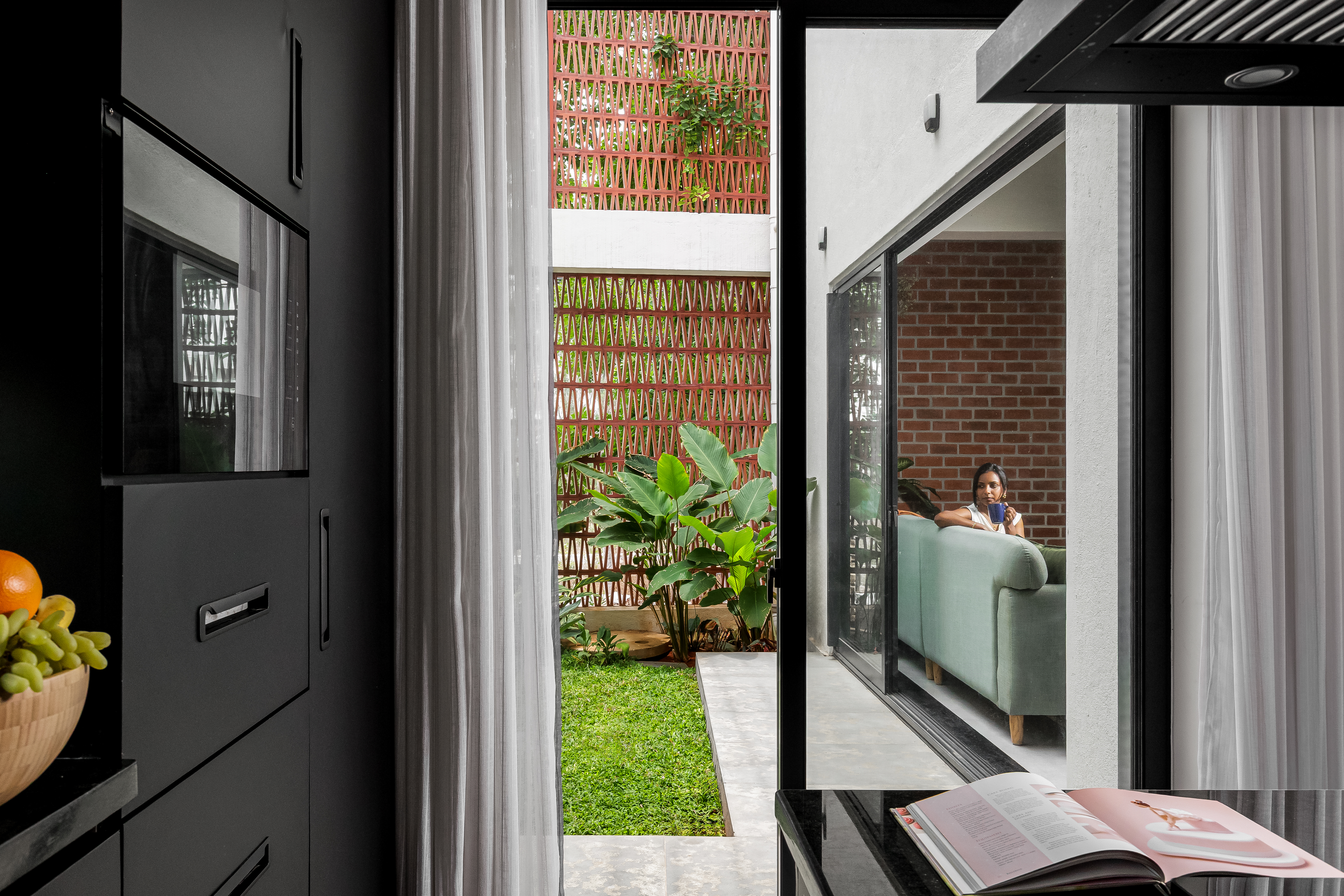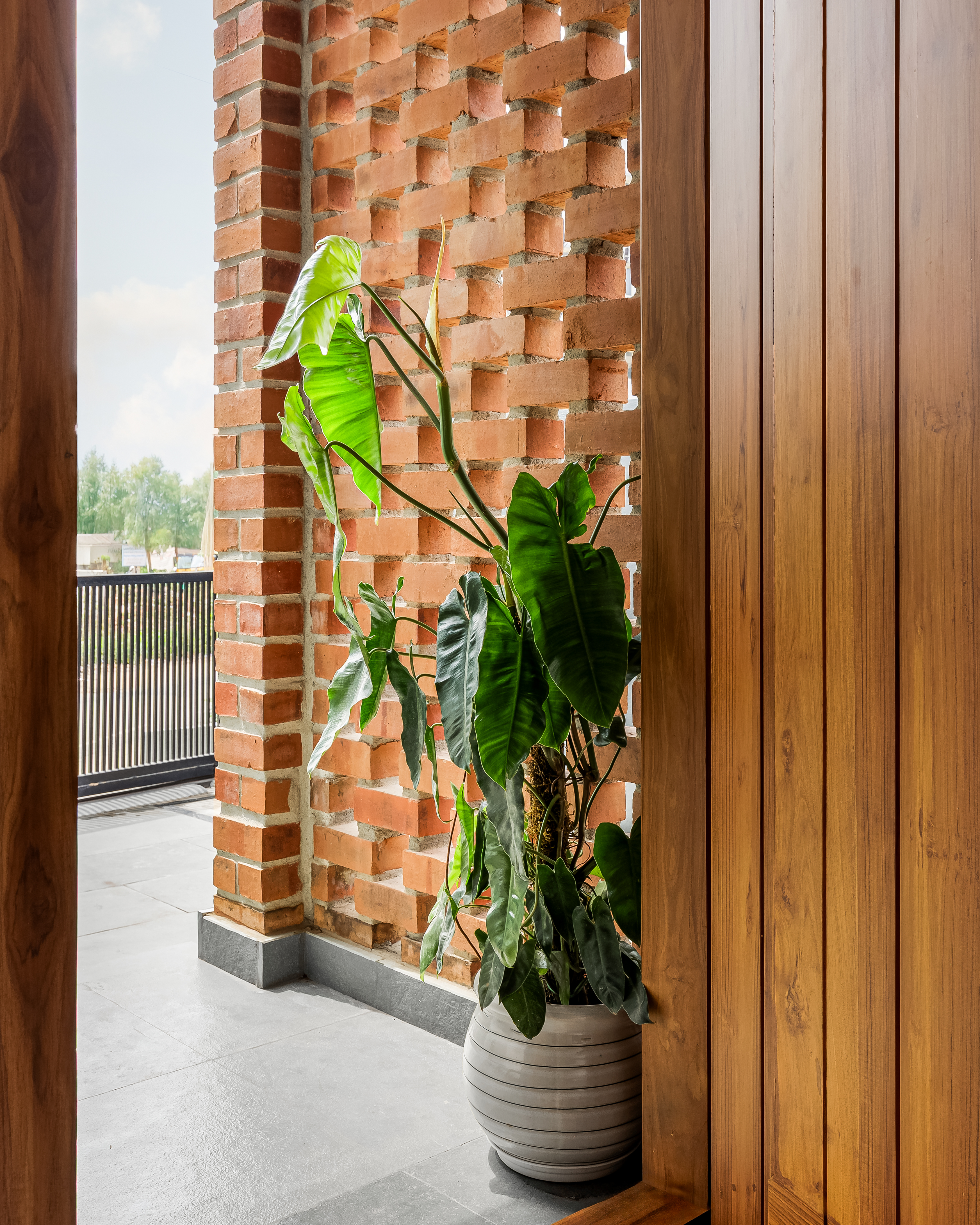 The courtyard, located in the northeast corner of the house, is surrounded by the main living functions. This double-height courtyard is enclosed on the north by a sturdy wall and features jali (lattice) work on the east side. Large windows allow filtered light to illuminate key spaces such as the living room, dining area, and kitchen. The jali walls serve as privacy screens while diffusing harsh sunlight from the south, ensuring good air circulation for the bedrooms located in the southwest.