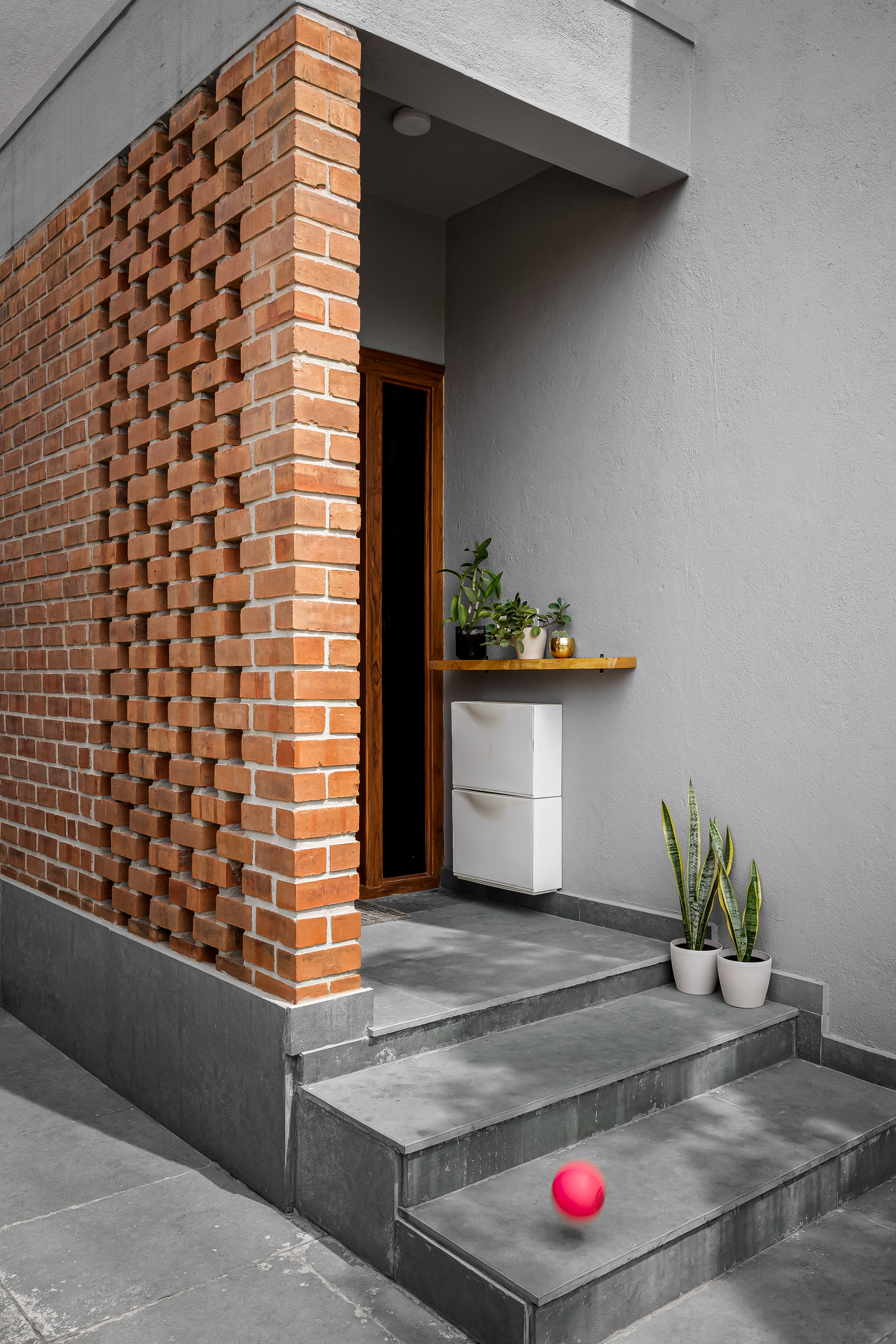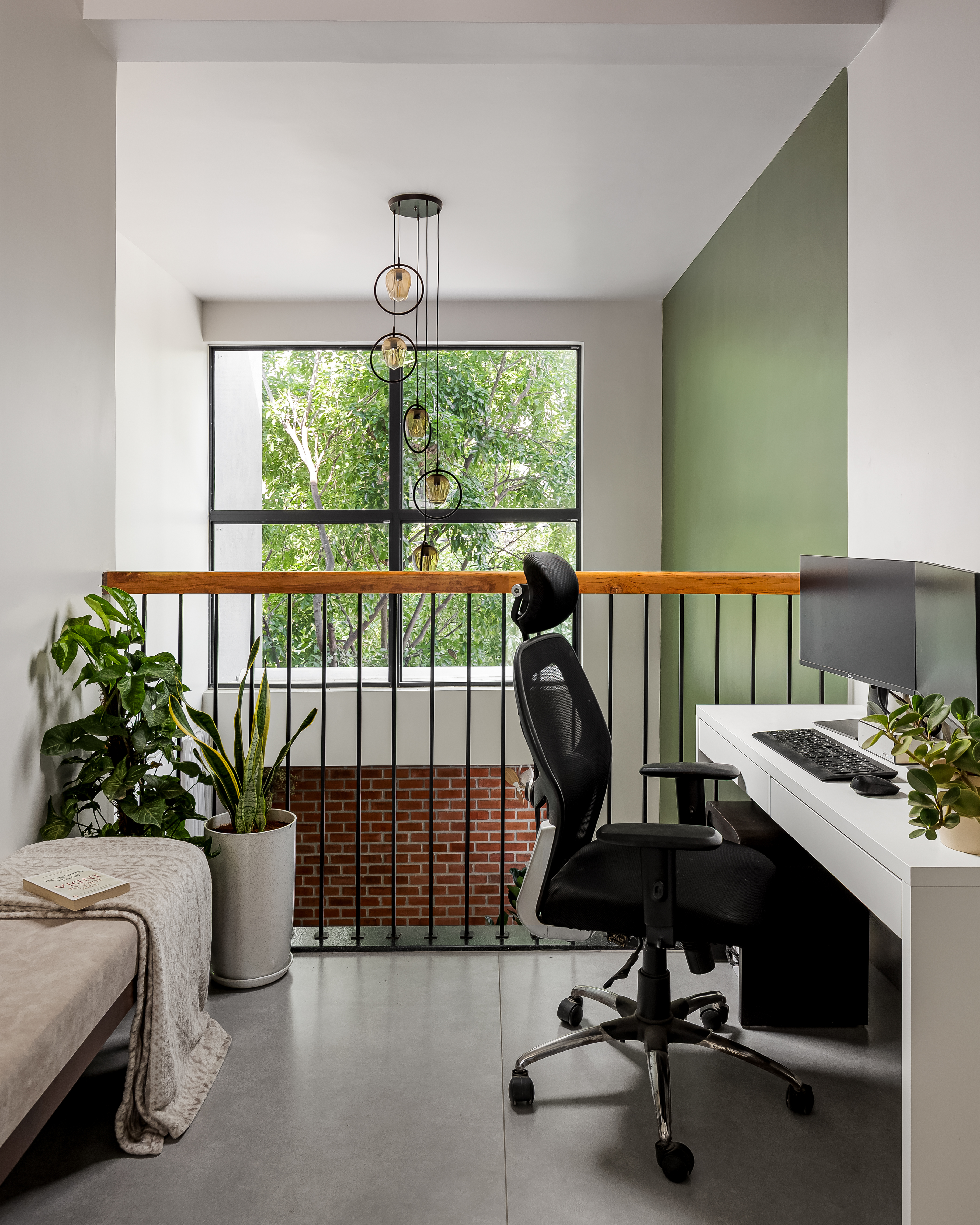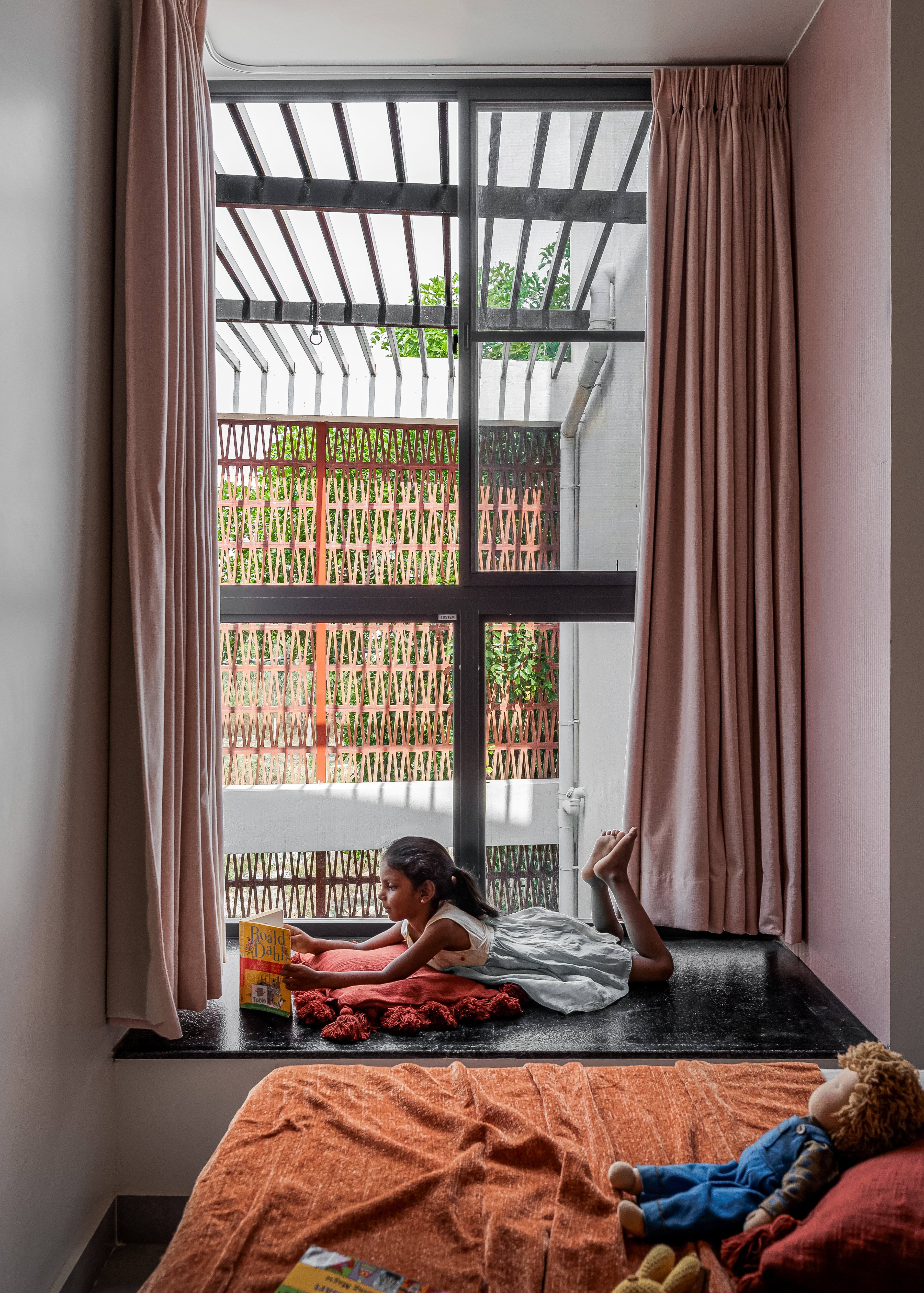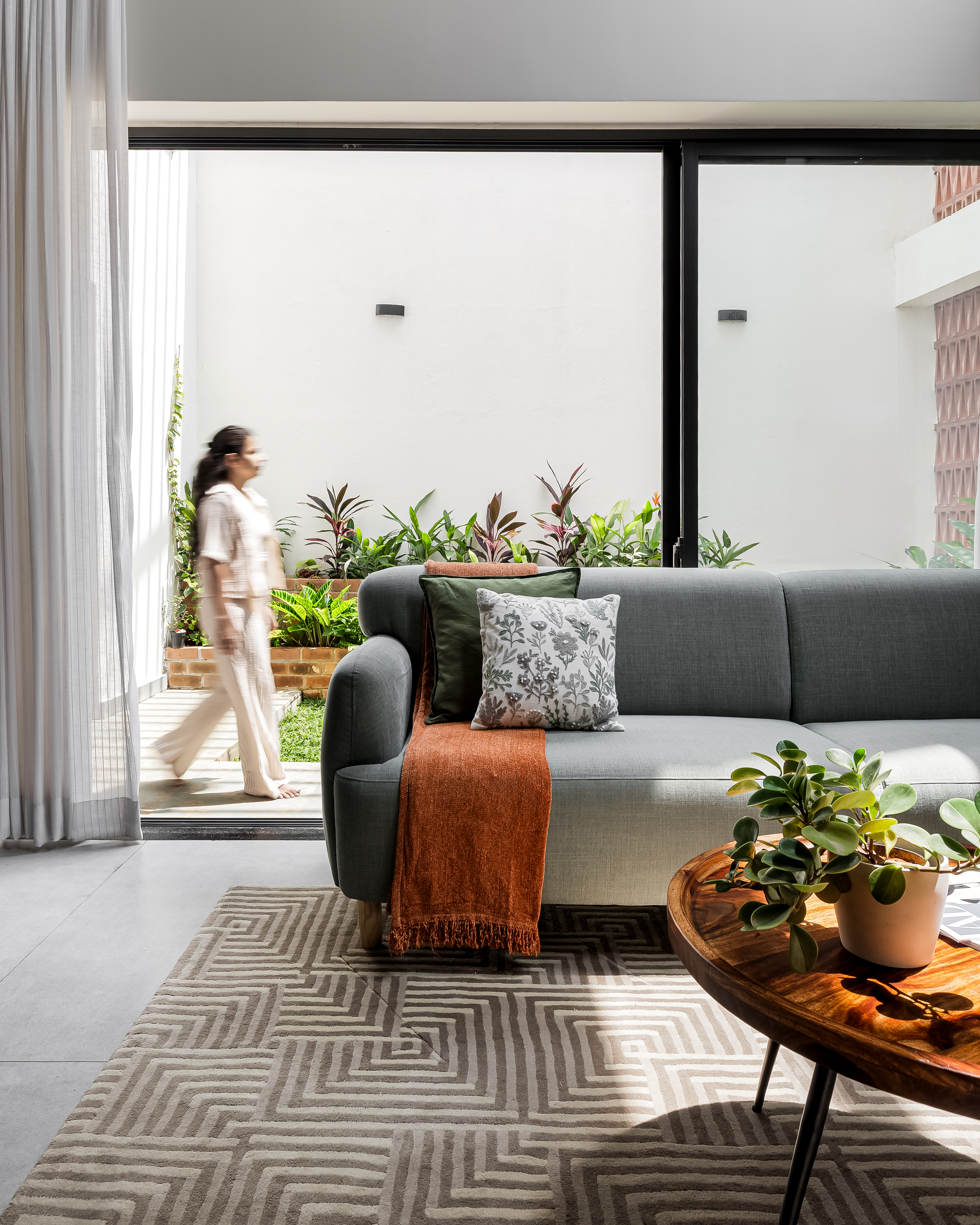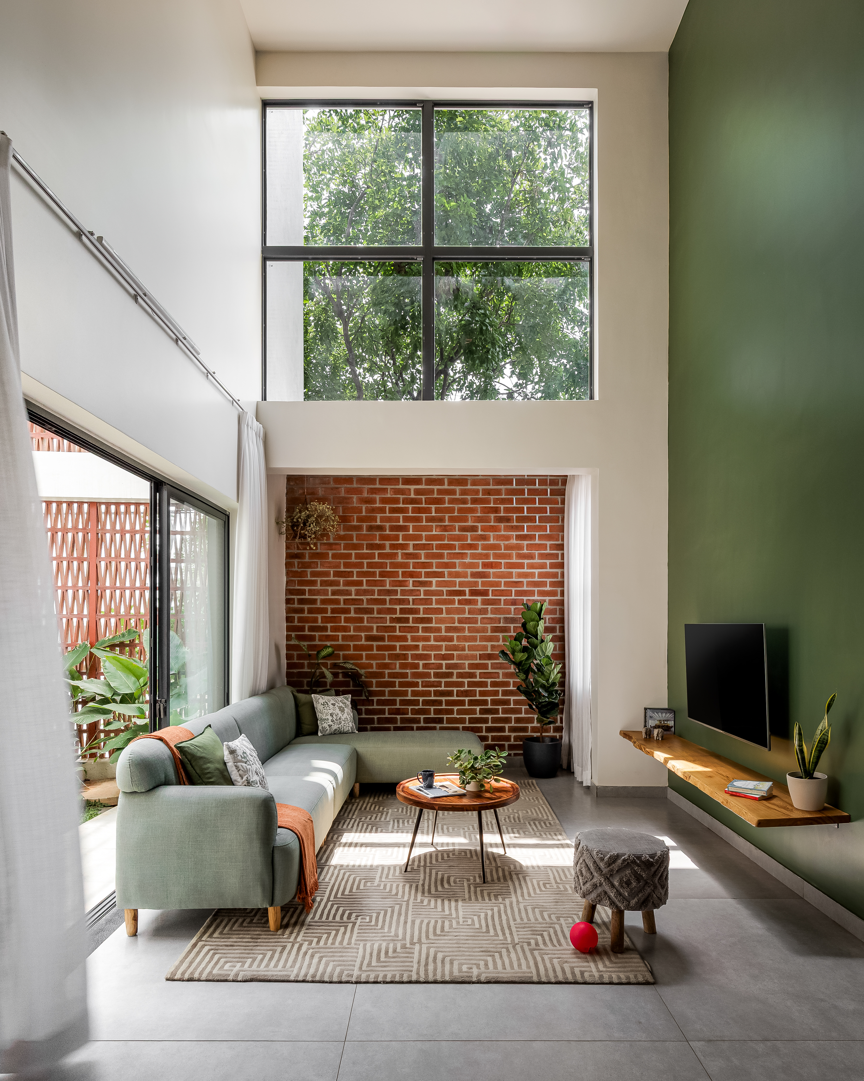 The courtyard, located in the northeast corner of the house, is surrounded by the main living functions. This double-height courtyard is enclosed on the north by a sturdy wall and features jali (lattice) work on the east side. Large windows allow filtered light to illuminate key spaces such as the living room, dining area, and kitchen. The jali walls serve as privacy screens while diffusing harsh sunlight from the south, ensuring good air circulation for the bedrooms located in the southwest.