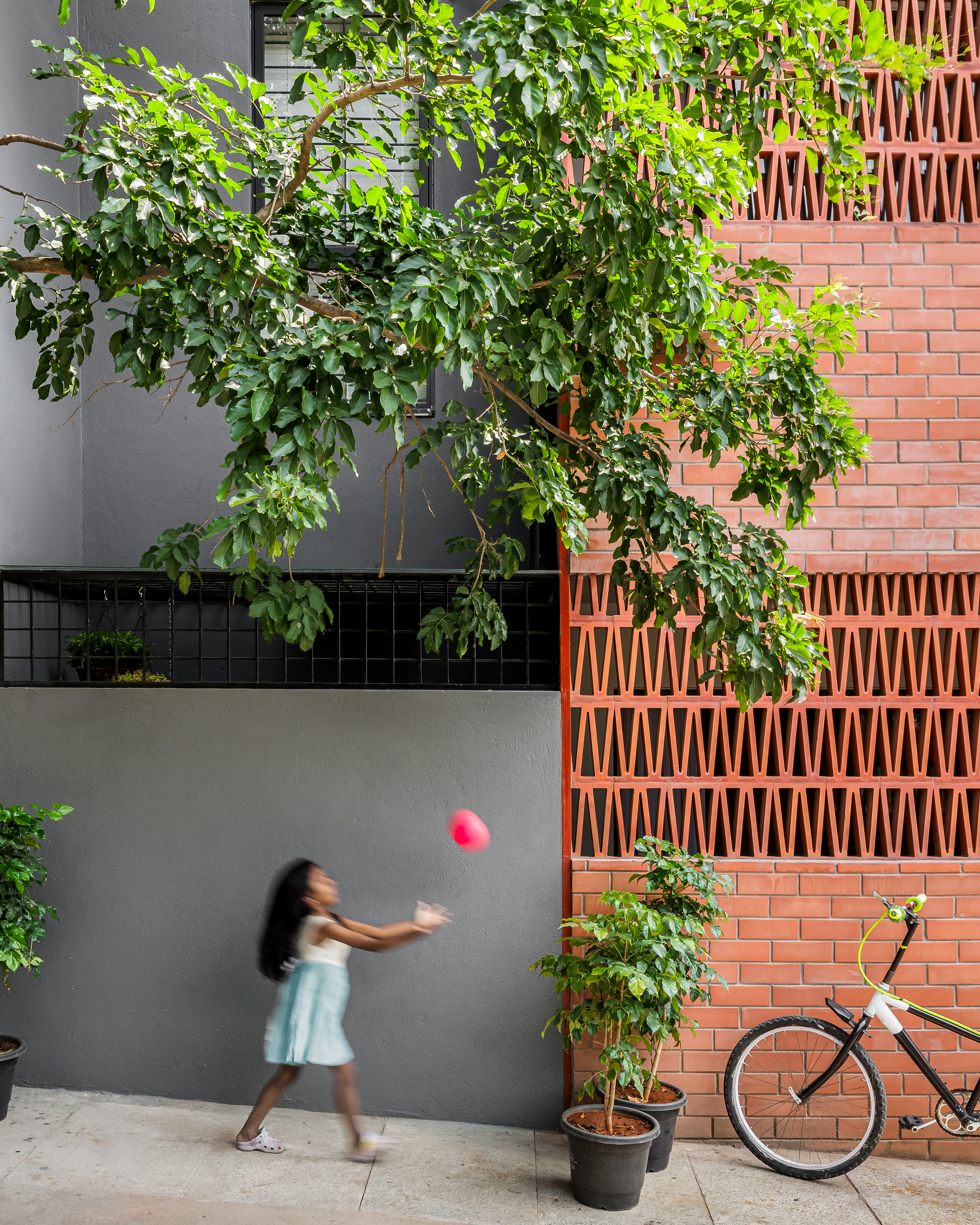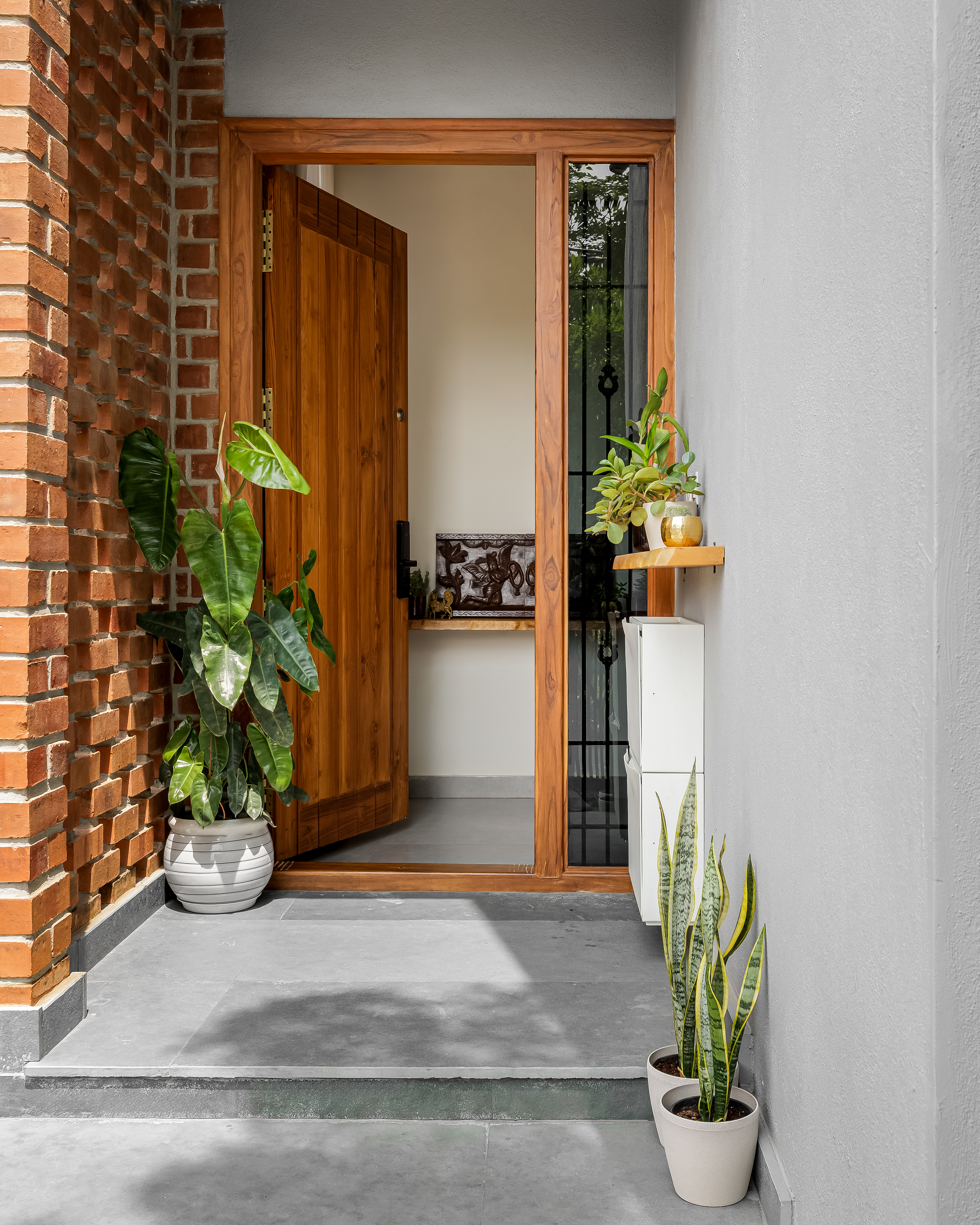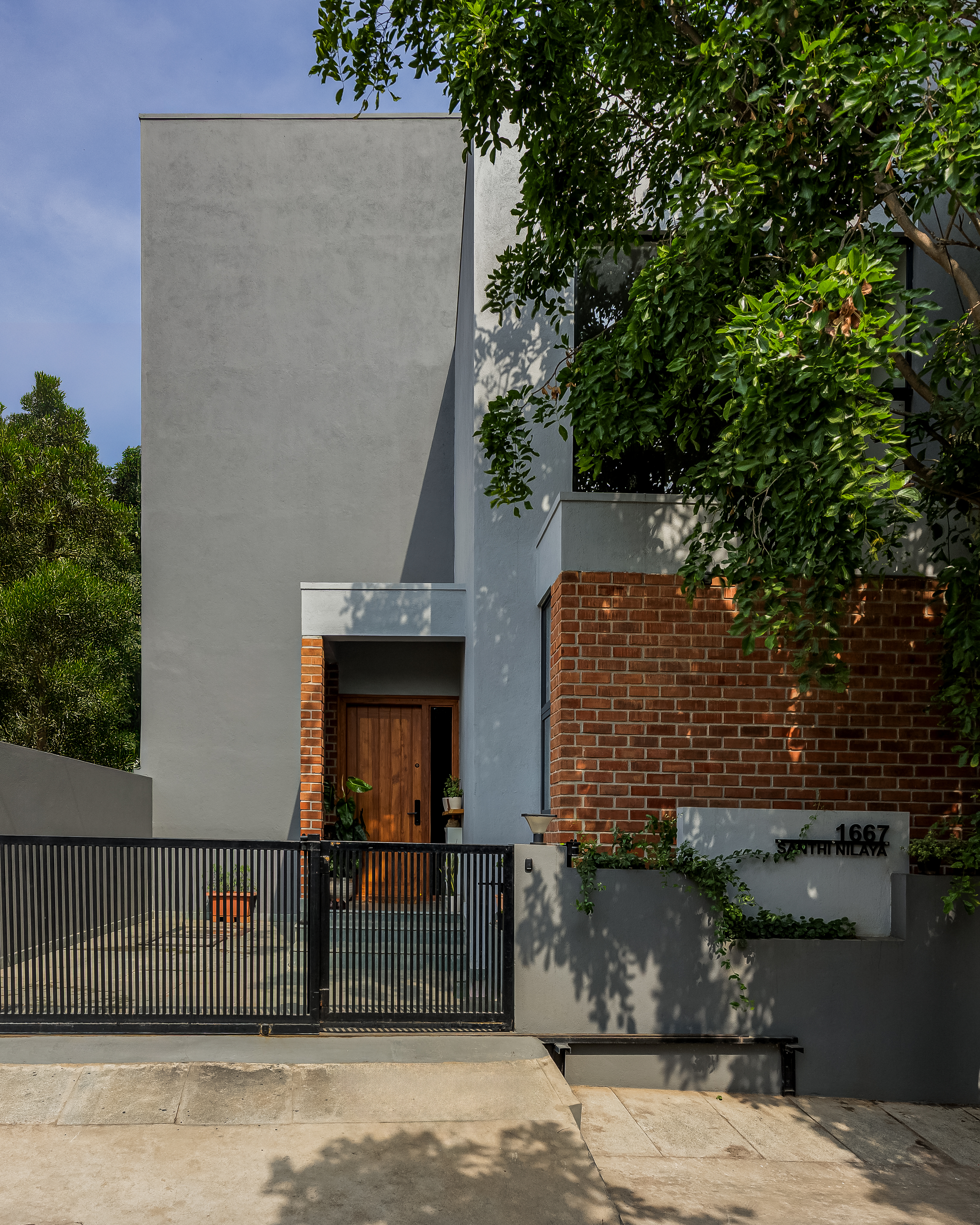 The courtyard house is situated on a corner plot measuring 40 feet by 45 feet, bordered by neighbouring plots to the north and west, with roads adjacent to the south and east. A distinctive honge mara (Indian Birch) tree flourishes on the eastern side, accompanied by several smaller trees.